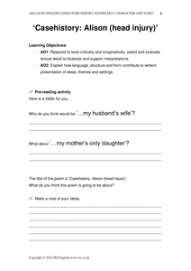 Casehistory: Alison (head injury) U A Fanthorpe 1929 - 2009 Task One Read the poem at least twice, using your phone or a dictionary to help define any unusual ... Access Full Source